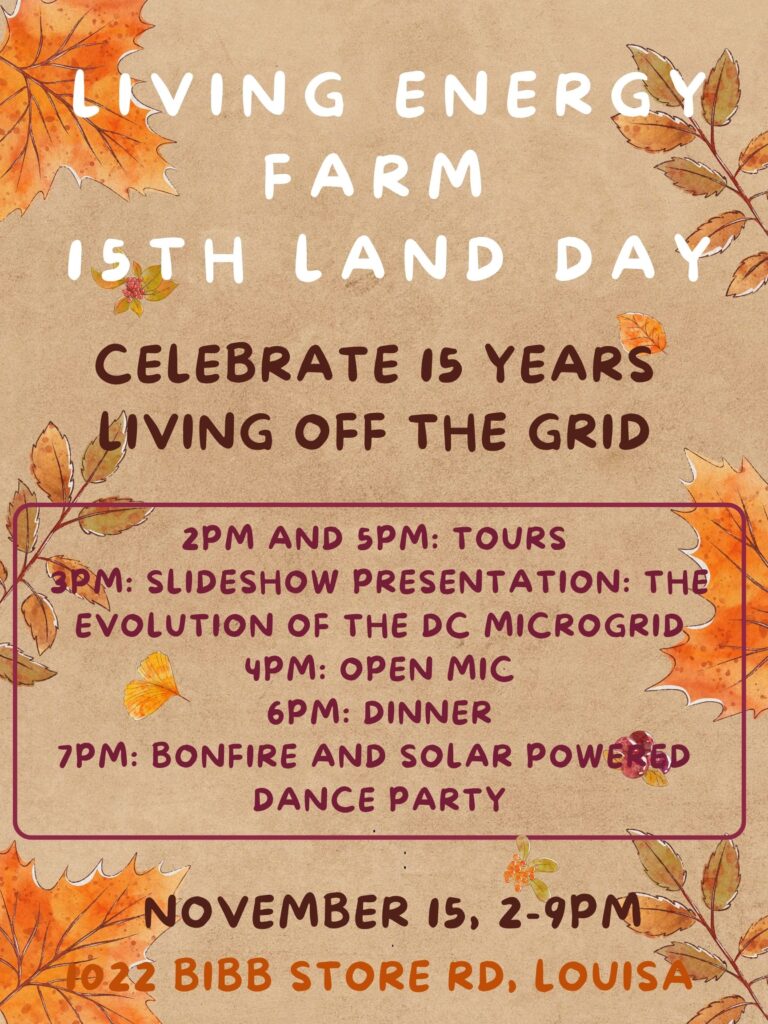 Living Energy Farm is an intentional community, education center, and farm that demonstrates that a fulfilling life is possible without the use of fossil fuel. Our mission is to serve as an example and actively promote lifestyles and technologies that are truly sustainable, and to make these sustainable technologies accessible to all persons regardless of their income or social position.